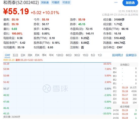9月23日,和而泰再度涨停,盘收55.19元/股,总市值510.40亿元,今年以来股价已暴涨206.40%。